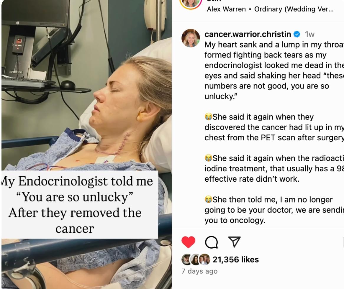 A few weeks later came the call - stage 3 thyroid cancer. I had surgery. They removed my entire thyroid, four masses, and six lymph nodes. The largest tumor was 3.5 inches long.